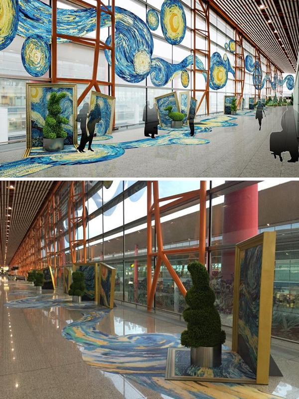 星空長廊以星空為主題,玻璃幕墻上有高為5.2米的星月夜圖案,沿途地面鋪設星月夜地貼,設置了六處動物造型綠植,有兔子、小熊、大象、麋鹿等動物造型,共計70米長。