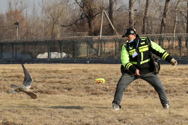 其中,針對(duì)機(jī)警的集群小型鳥(niǎo)類(lèi),首都機(jī)場(chǎng)在跑滑區(qū)域鳥(niǎo)網(wǎng)桿頂部增加了泛光飄帶、彩色風(fēng)輪等視覺(jué)設(shè)備進(jìn)行干擾,同時(shí)組織人工驅(qū)鳥(niǎo)隊(duì)伍采取視覺(jué)、聽(tīng)覺(jué)震懾驅(qū)趕等措施,避免鳥(niǎo)類(lèi)逗留。而針對(duì)大型猛禽,首都機(jī)場(chǎng)則采用獵鷹驅(qū)鳥(niǎo)為主、“土方”捕捉為輔的方式,鷹舍獵鷹“傾巢而出”,“絆腳籠、鷹叉、鴿衣”等各種民間驅(qū)鳥(niǎo)方式各顯神通,收到了良好效果。